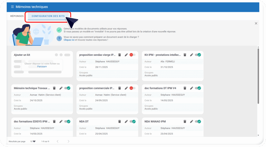 - Pour ajouter un nouveau kit de réponse, accédez à l’onglet « Mes réponses » > « Mémoires techniques », à partir du menu général.
