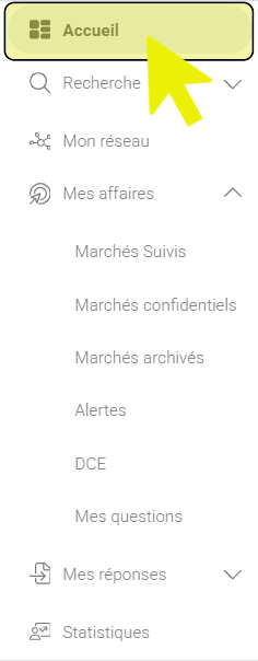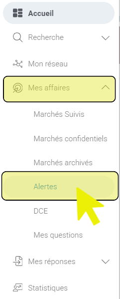 - Pour cela, cliquez sur les onglets « Mes Affaires » et « Alertes » du menu principal à gauche :