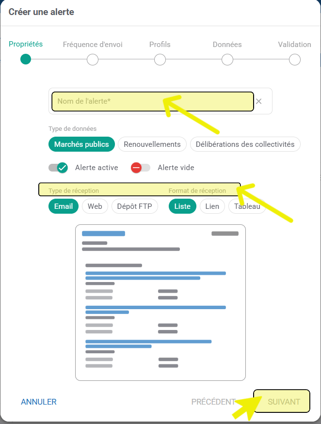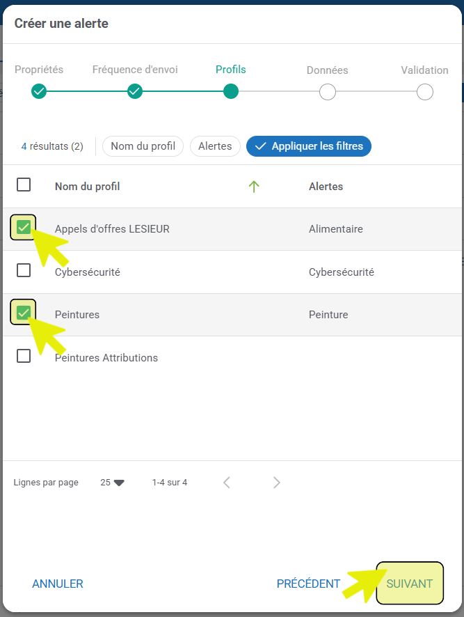 - Dans la rubrique « Profils », choisissez le(s) profil(s), que vous souhaitez intégrer à votre alerte et cliquez sur le bouton « Suivant » :
