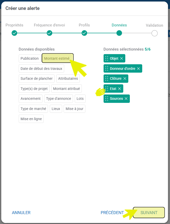 - Dans la rubrique « Données », vous pouvez sélectionner le(s) colonnes(s) du tableau, que vous souhaitez intégrer à votre alerte, en cliquant sur les champs correspondants.