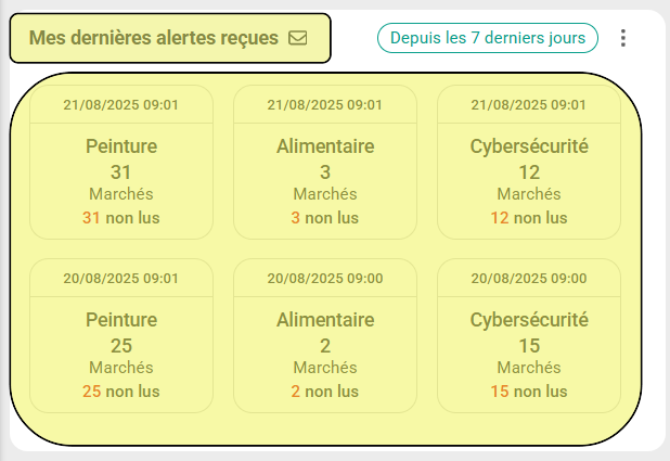 - Dans le bloc widget « Mes dernières alertes reçues », vous retrouvez vos alertes reçues, intégrant les nouveaux marchés (ci-dessous, elles sont affichées par date de réception) :