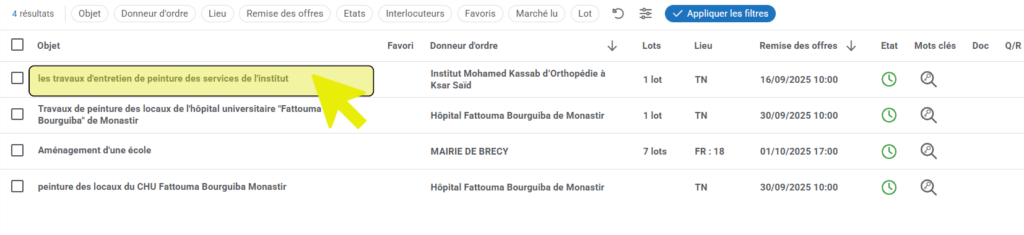 - Pour visualiser une alerte, cliquez ensuite sur l’objet du marché :