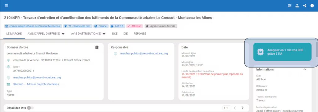 - Depuis la fiche marché , vous pouvez analyser en 1 clic vos DCE, grâce à l’IA :