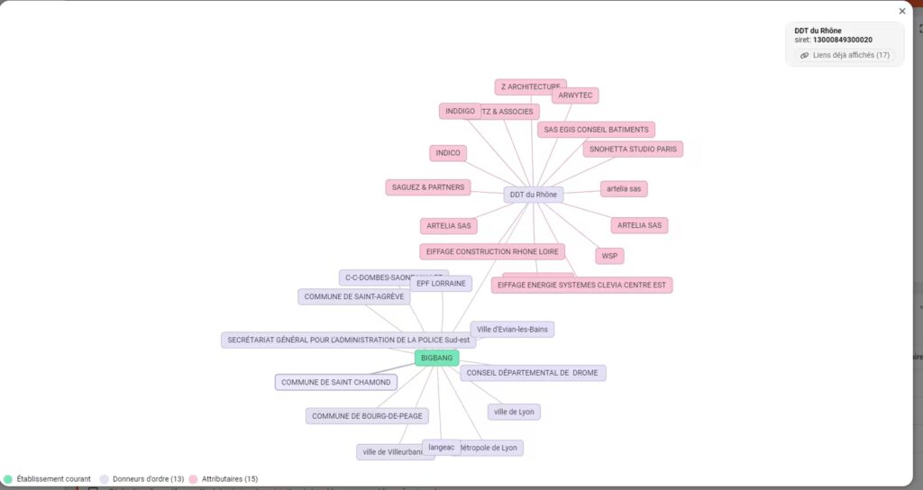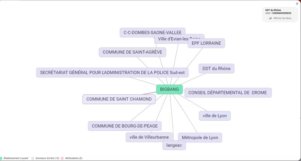 - Dans l’exemple ci-dessous, nous pouvons voir les donneurs d’ordres, avec lesquels la société BIGBANG a été en relation dans le cadre des marchés publics :