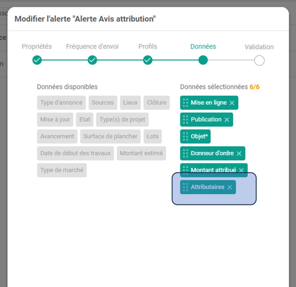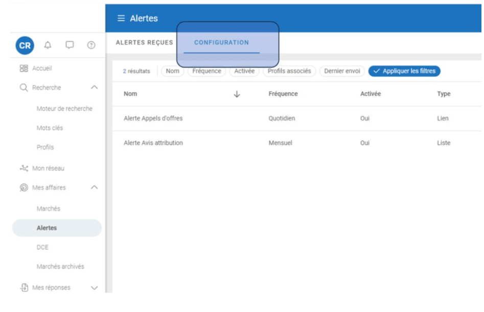 - Le champ « Attributaires », visible depuis la plateforme, a été ajouté dans la configuration de vos alertes emails, afin de disposer de cette information, sans vous connecter à la plateforme.