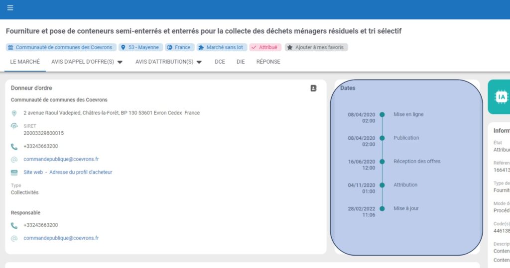 - Les informations et coordonnées du responsable du marché sont dorénavant intégrées dans la rubrique « Donneur d’ordre« .