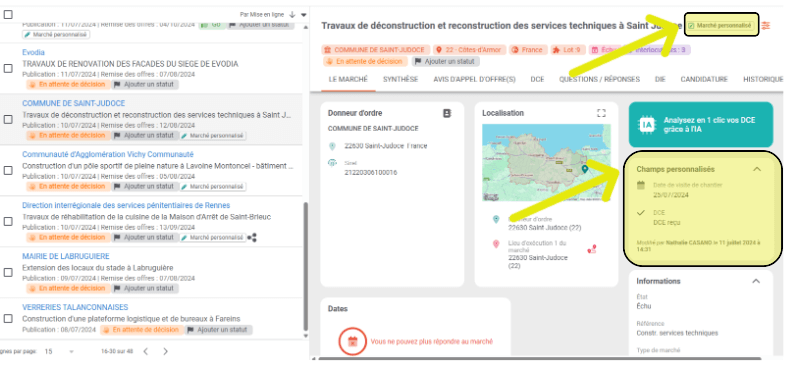 VUE DETAIL > Annotation des champs personnalisés et mention « marché personnalisé » visibles