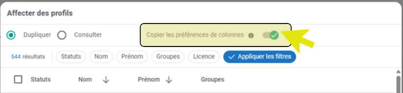 Lors de la duplication des profils, vous pouvez également dupliquer la préférence de colonne sélectionnée, afin qu’elle soit appliquée aux profils dupliqués :