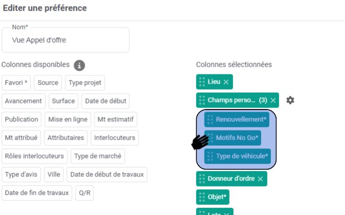 Afin de personnaliser vos vues et afficher les colonnes de vos champs personnalisés dans vos marchés suivis, vous pouvez, en cliquant sur préférence de colonnes, sélectionner l’ordre d’affichage de vos champs personnalisés :