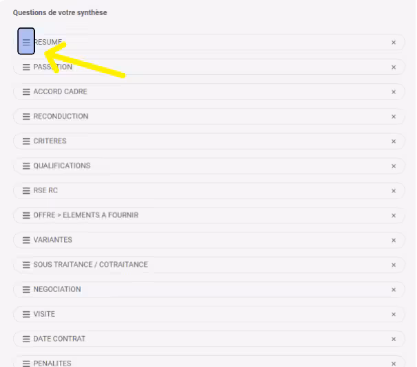 - Vous pouvez ordonnancer les questions de votre synthèse, en cliquant et en maintenant appuyé le menu :