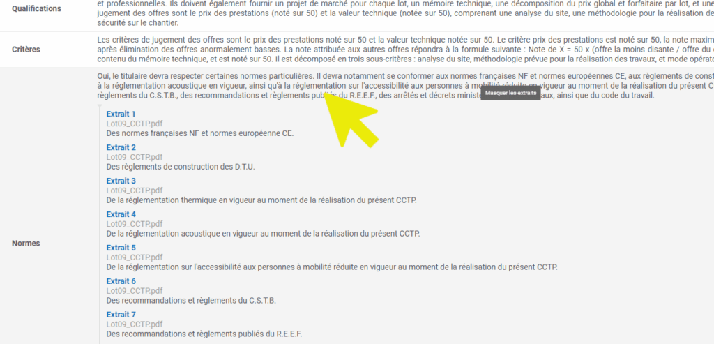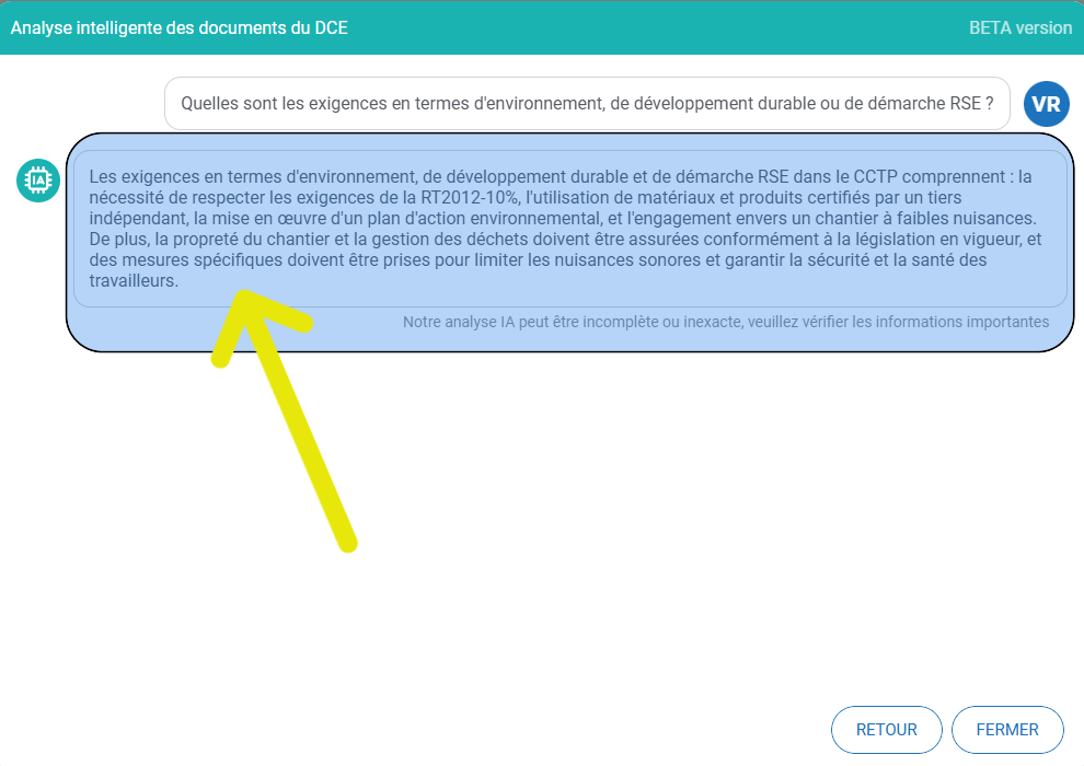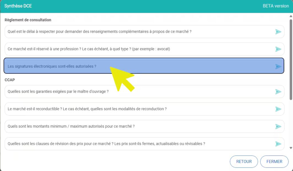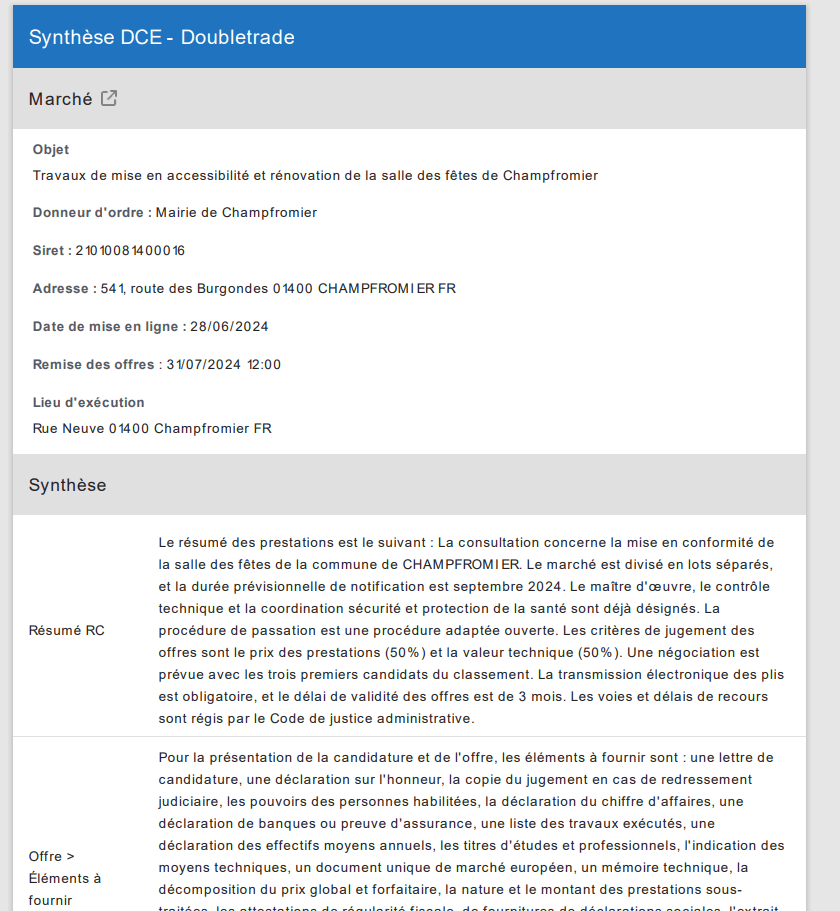 Vous obtenez alors directement une synthèse des réponses à 14 questions clés, générées automatiquement, à partir de l’analyse du DCE :
