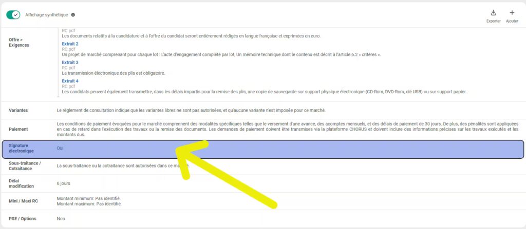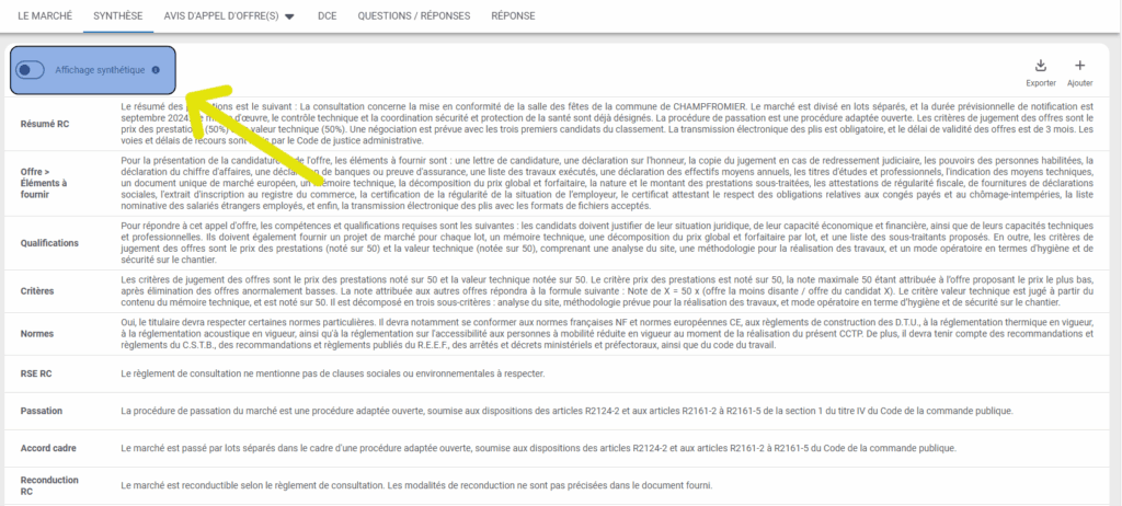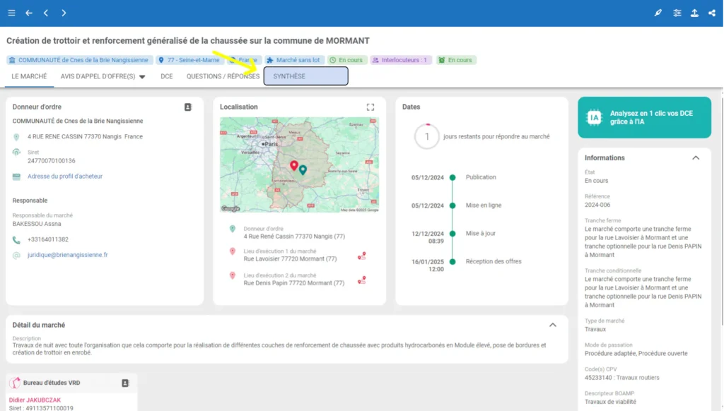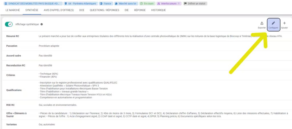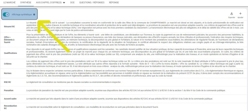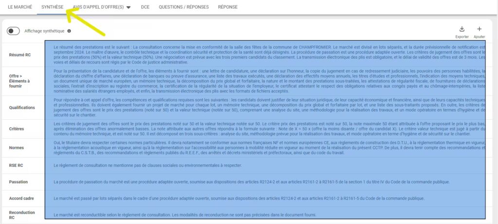 - Depuis le marché, cliquez sur l’onglet « Synthèse », qui se trouve en dessous du titre du marché :