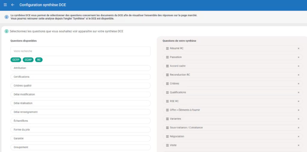 - Vous pouvez personnaliser la synthèse DCE, afin de choisir les questions à poser sur chaque marché, ainsi que l’ordre d’affichage des réponses.
