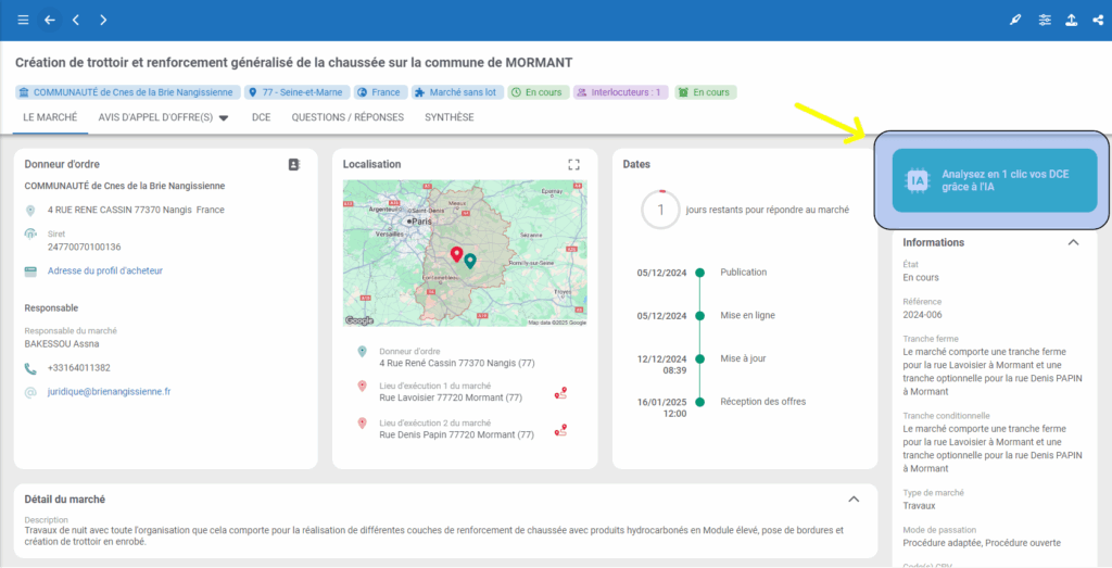 - Depuis le marché, cliquez sur le bouton « Analysez en 1 clic vos DCE grâce à l’IA » :
