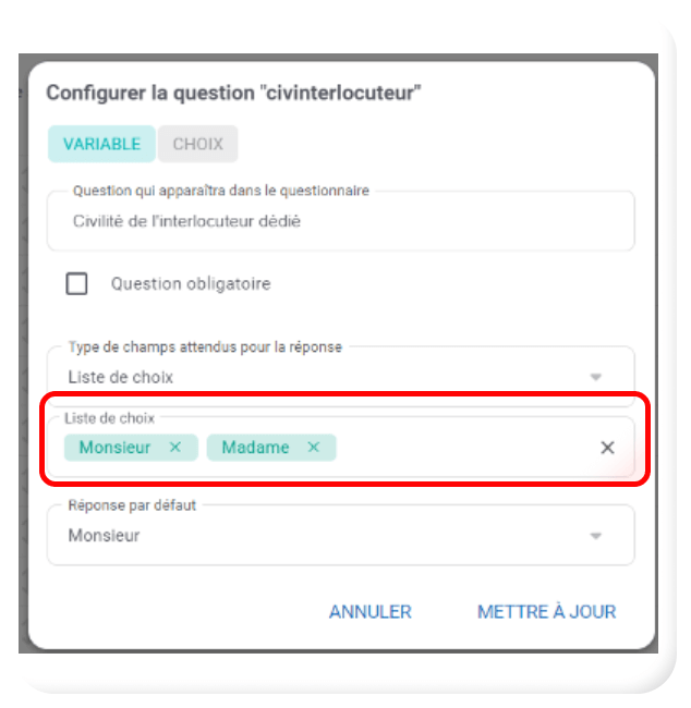 - Exemple : On paramètre une question « Civilité de l’interlocuteur », avec une liste avec comme choix « Monsieur » et « Madame ».
