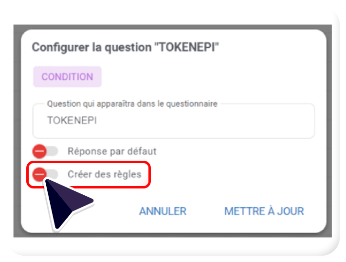- Si l’on souhaite que cettecondition soit vraie ou fausse, en fonction de réponses apportées à d’autres questions, il vous faudra sélectionner « Créer des règles ».