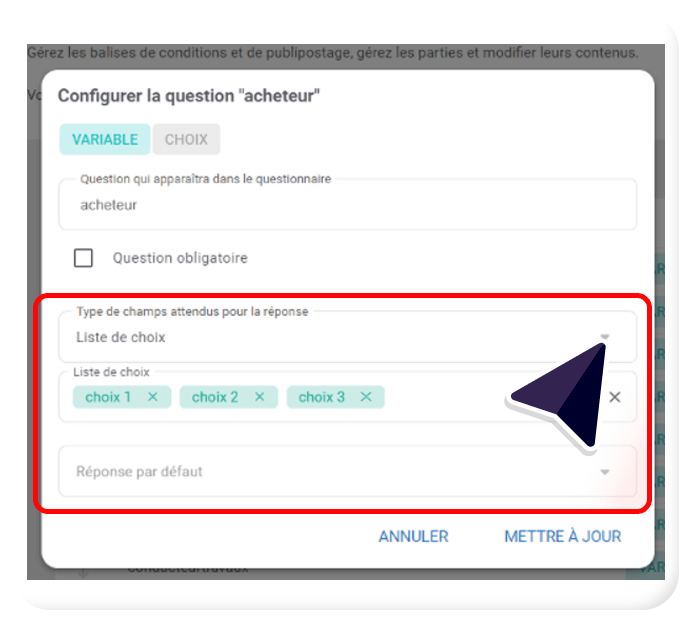 Configurer une question « Liste de choix » :
