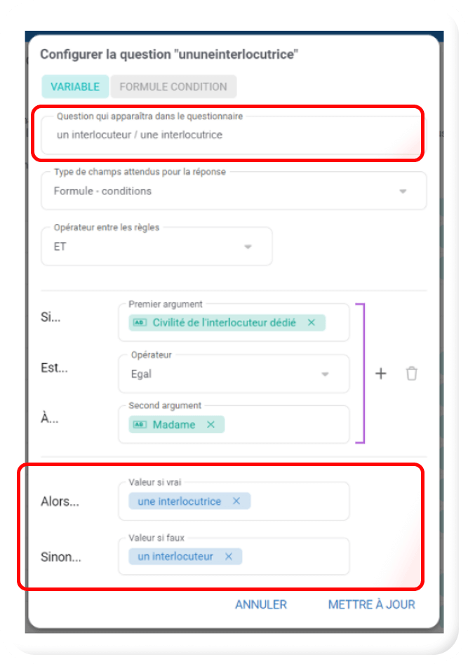 - Je souhaite que la balise « un interlocuteur/ une interlocutrice » prenne la valeur « un interlocuteur », si le choix de l’utilisateur est « Monsieur », et « une interlocutrice », si le choix de l’utilisateur est « Madame » :