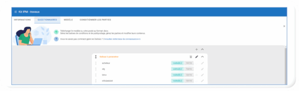 - Pour paramétrer une question, liée à une balise de type « Texte », rendez vous sur l’une des balises de type « VARIABLE ».