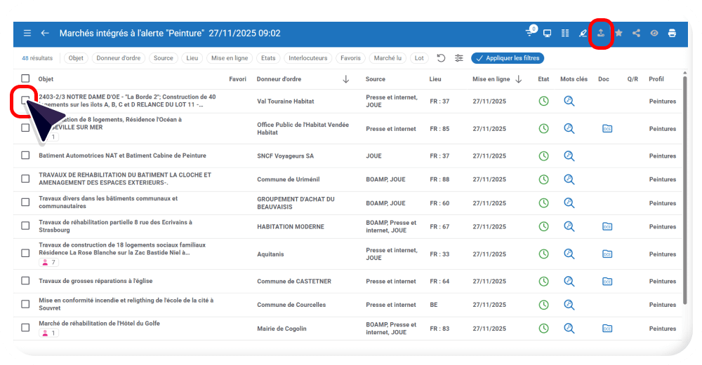 • Dans la liste des résultats de vos marchés, au lieu de sélectionner un ou plusieurs marchés, veuillez cocher « Objet » (tout en haut de la liste des résultats) :