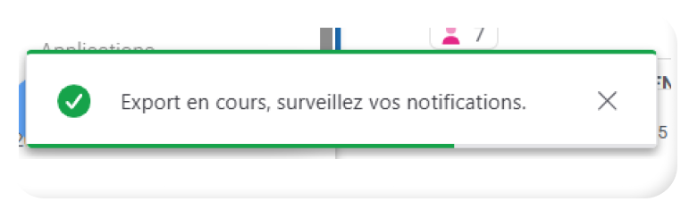• Un message d’avertissement vous indique alors que l’export est en cours et que vous recevrez une notification, lorsque l’export sera finalisé :