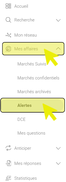 - Pour accéder à la fonctionnalité « Export JSON », dirigez-vous d’abord dans le Menu principal de votre plateforme Insight, en cliquant sur les onglets « Mes affaires » et « Alertes » :