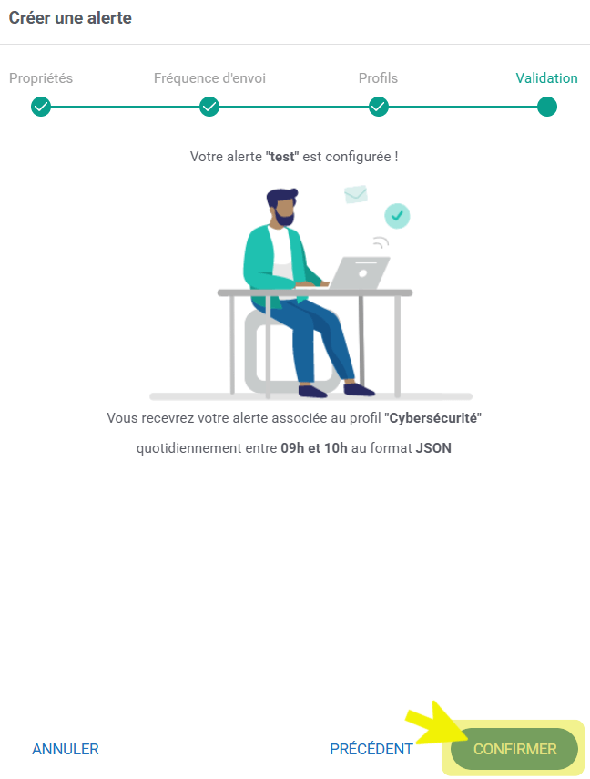- En validant la création de votre alerte, en cliquant sur le bouton « Confirmer », dans la partie « Validation ».