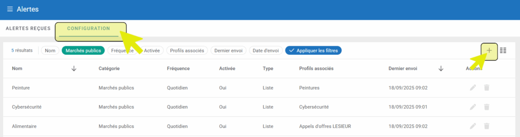 - Sur la page « Alertes », cliquez ensuite sur l’onglet « Configuration », puis sur le bouton « + », en haut à droite de la page, afin de créer une nouvelle alerte :
