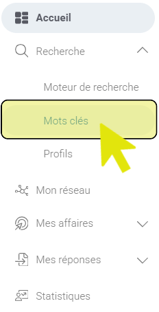 - Cliquez à gauche sur les onglets « Recherche » et « Mots clés » :