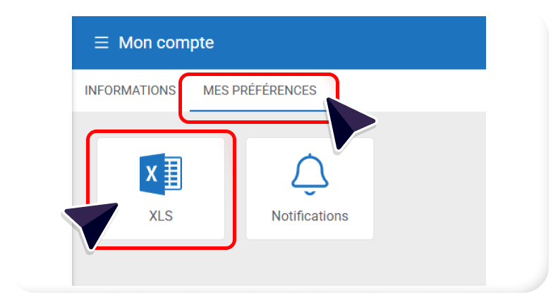 - Ensuite, sélectionnez l’onglet « Mes préférences », et cliquez sur « XLS » :
