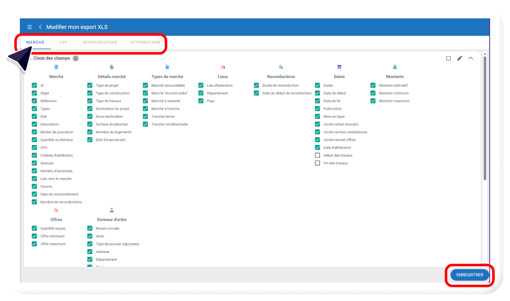 - Une fois votre sélection effectuée, cliquez sur le bouton « Enregistrer », afin que le paramétrage soit pris en compte, lors de vos prochains exports de marchés au format Excel.