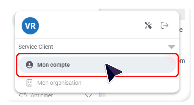 - Pour accéder au module de gestion des colonnes Excel, cliquez sur vos initiales, en haut à gauche, puis sur le menu « Mon compte » :