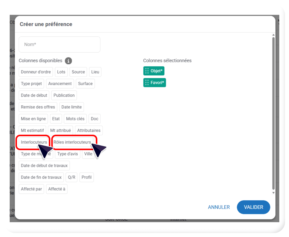 - Ici, nous souhaitons par exemple afficher certaines colonnes de la Section Interlocuteurs :