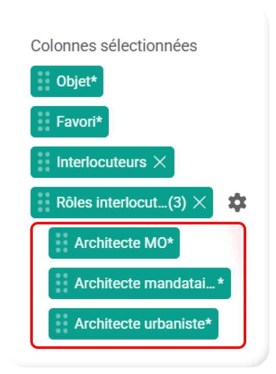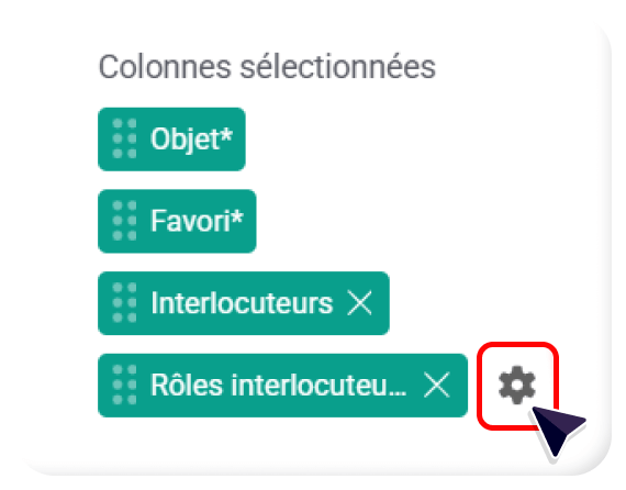 - Les champs viennent s’ajouter dans « Colonnes sélectionnées », à droite de la pop-up. Cliquez ensuite sur la petite roue crantée et sélectionnez les colonnes à afficher :