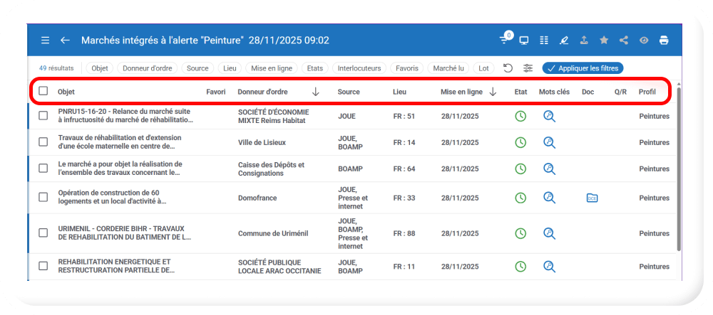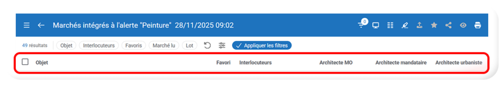 - En mode « Vue Tableau », par exemple, sur la page de vos « Marchés Suivis », un affichage par défaut des colonnes et de vos données vous est proposé :