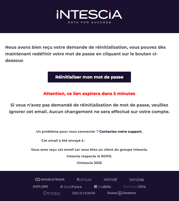 Ci-dessous, l’exemple du mail que vous devez recevoir instantanément après avoir cliqué sur le bouton soumettre. Attention le lien présent dans l’e-mail n’est valable que cinq minutes pour des raisons de sécurité. Au-delà de ce délai, il faut renouveler l’opération.