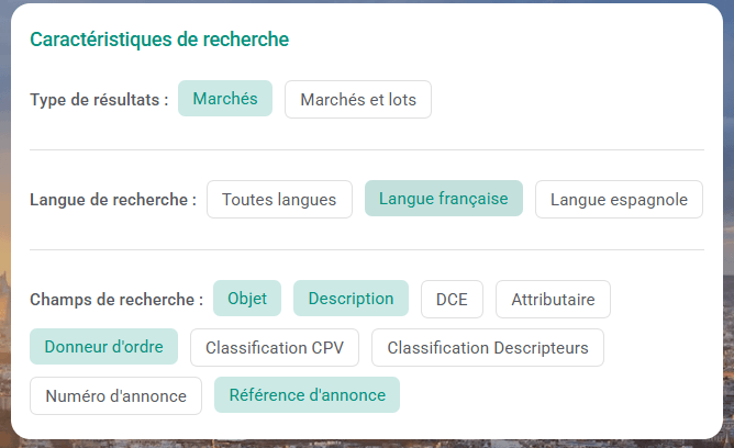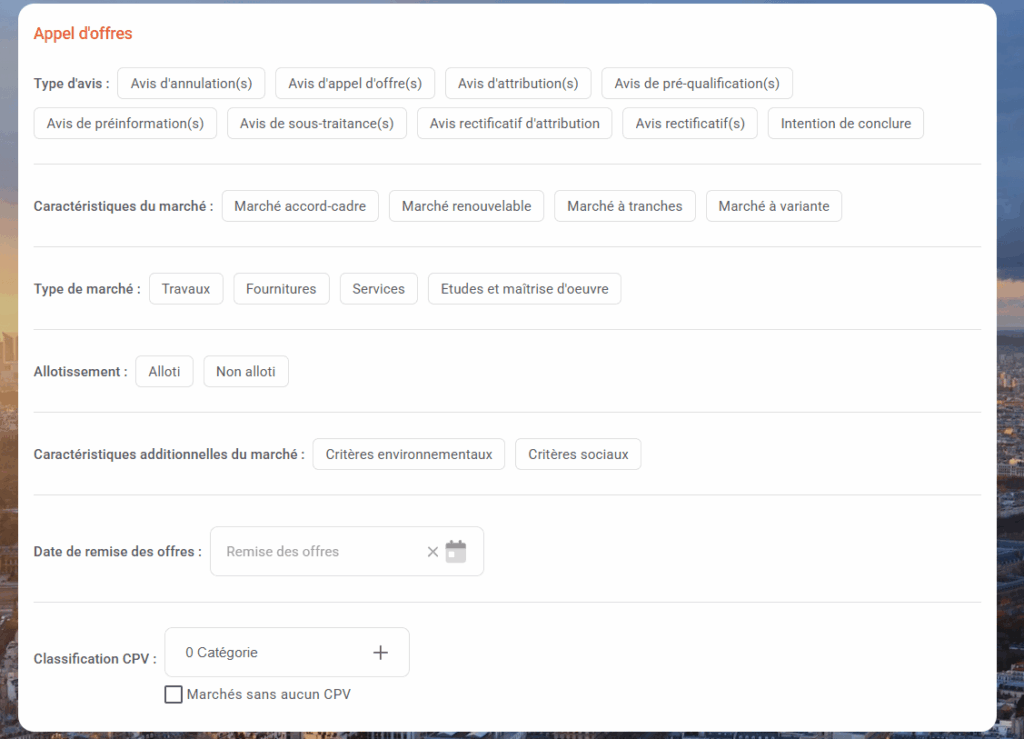 - Indiquez si vous souhaitez recevoir uniquement des marchés avec certains critères :