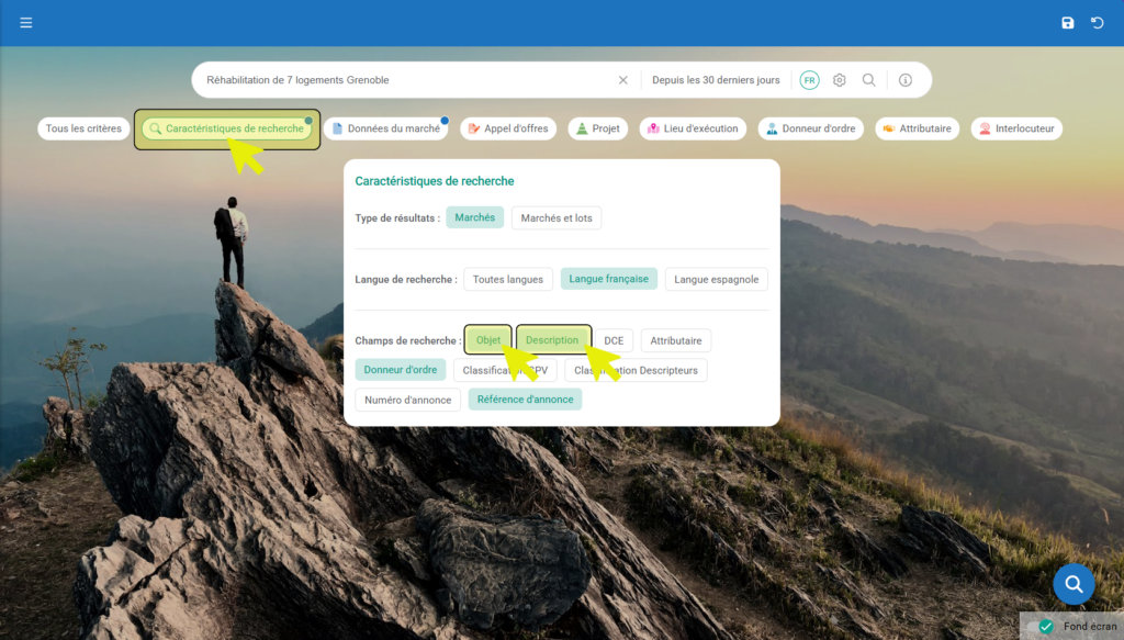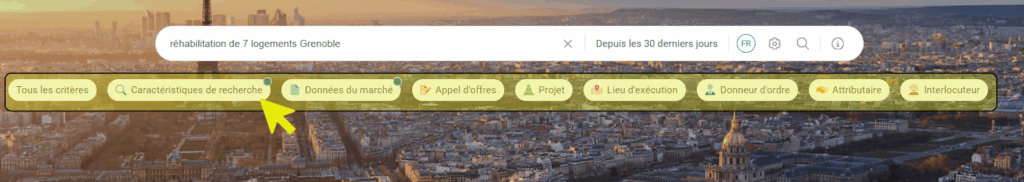 - Indiquez les caractéristiques, propres à votre marché, pour affiner votre recherche :