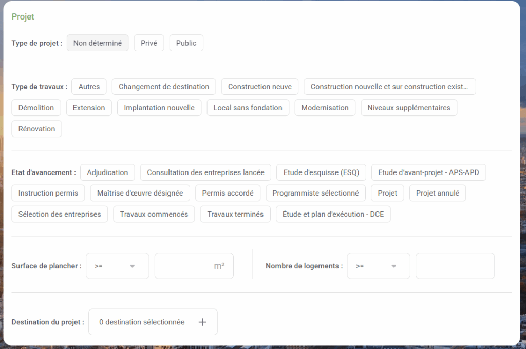 - Affinez votre recherche, en indiquant le type de projet souhaité :