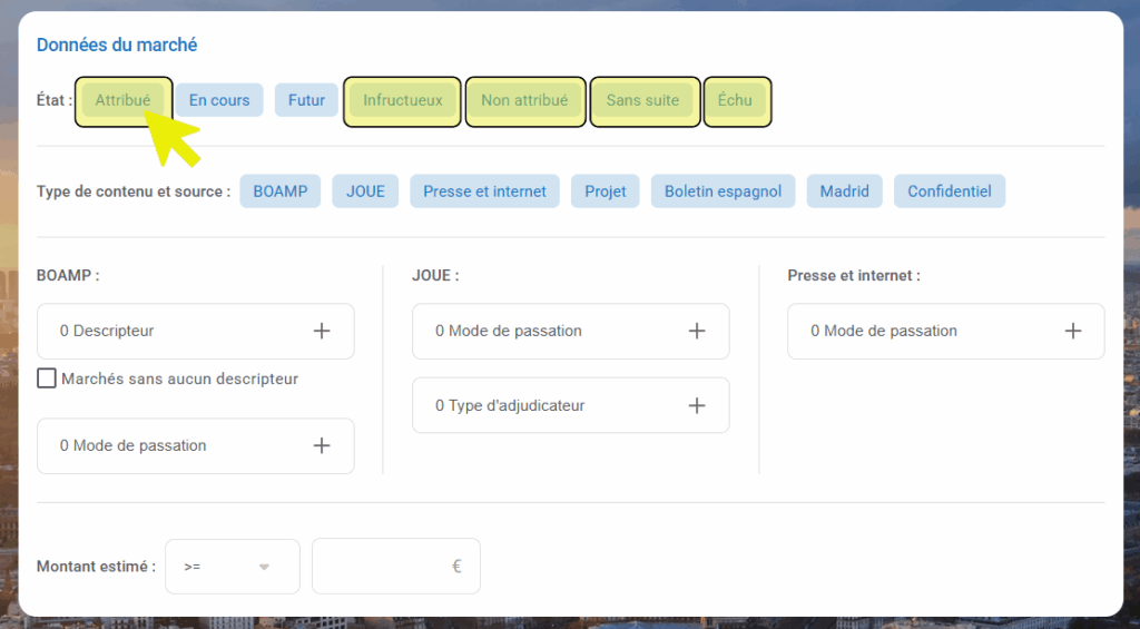 - Vous pouvez affiner votre recherche, en fonction du montant estimé du marché :