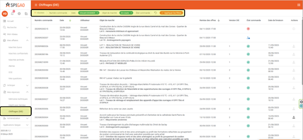 • Lapage « Chiffrage DCI (ex-DIE) », accessible à partir du menu principal de la plateforme Insight, présente l’ensemble des commandes passées, annulées ou en cours, avec des tris possibles par dates (de commande ou de remise) et des filtres ajustables :