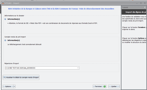 - La fenêtre me donne les informations spécifiques du dossier importé.