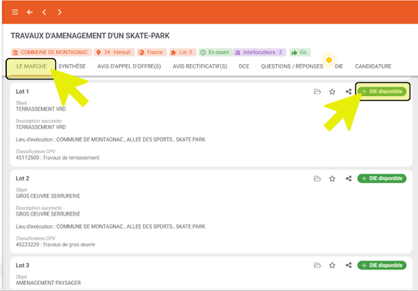 - Depuis l’onglet « Le Marché » de l’affaire sélectionnée , en cliquant sur le bouton « DCI (ex-DIE) disponible » :