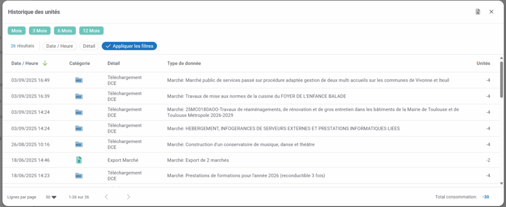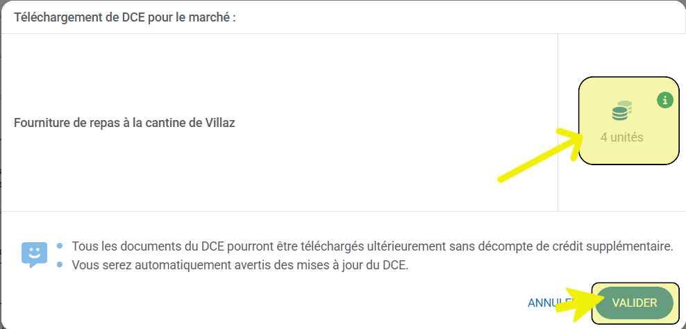 • Le téléchargement du DCE débitera votre compteur de 4 unités :