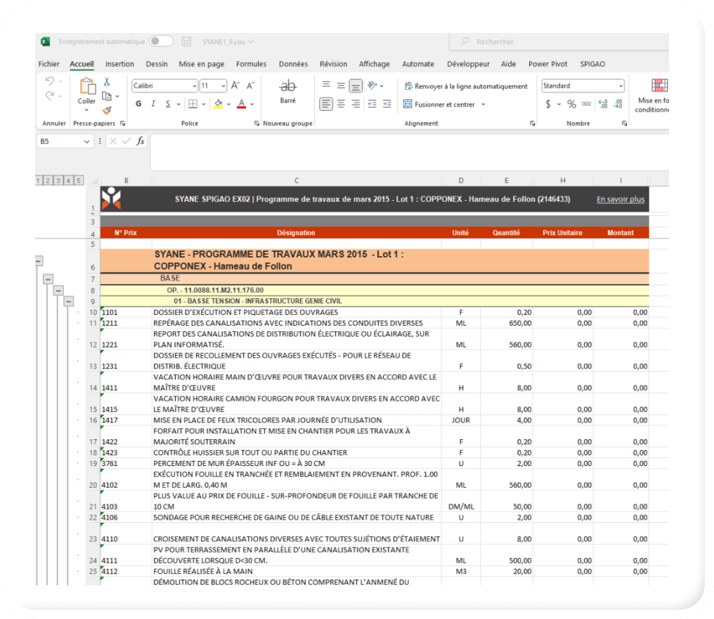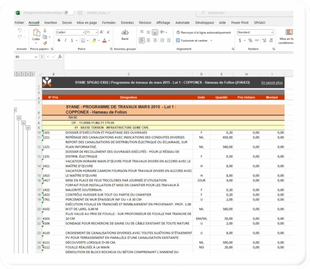 - Les documents originaux du marché (Excel/Word/PDF) s’ouvrent alors, avec votre chiffrage reporté.