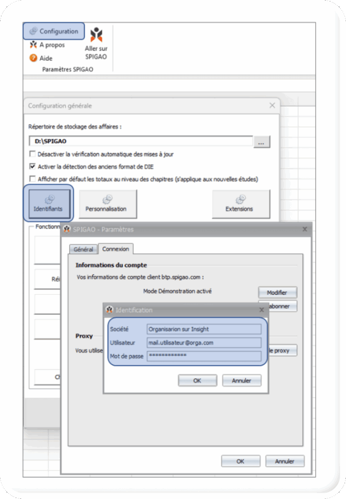Dans le menu SPIGAO, cliquer sur « Configuration » > « Identifiants« , puis saisir les informations, comme suit :